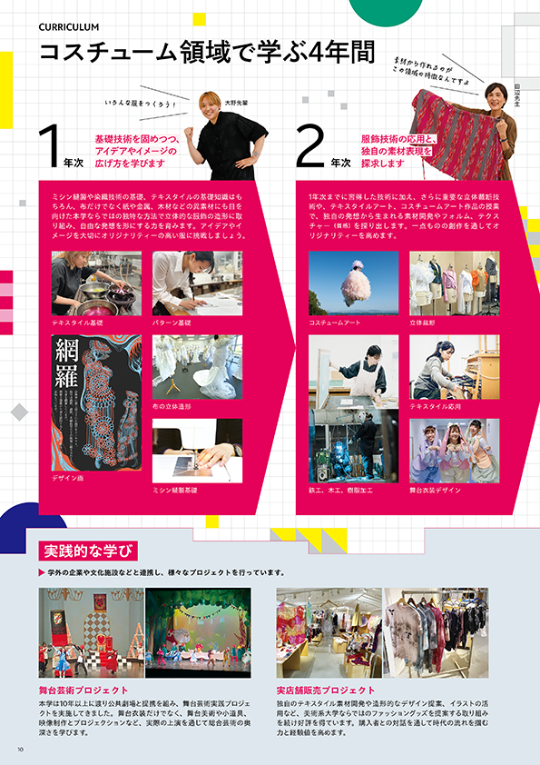 コスチューム領域は、100年の服飾教育の歴史を持つ本学園が設立した、全国の4年制芸術大学で初めてのコスチューム教育機関です。芸術大学・芸術学部ならではのフレキシブルなカリキュラムを導入。服飾デザインだけではなく染色や機織りなどのテキスタイル伝統技術、シルクスクリーンプリント技術、ファッショングッズの販売、ダンスやミュージカルの舞台衣装デザインも多数実践しつつ、コスプレ・デジタルファッション分野への拡大も予定しています。学園創立時から大切にしてきた、技術力と作品力で生きぬく力を身につける教育を受け継ぎ、コスチュームからデイリーウェアに至るまで革新的でグローバルな提案力のある人材を育成します。