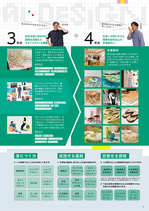 各コースで専門的な知識や技能をしっかりと学んだ上で、キャリア形成の必要に応じた柔軟性のあるカリキュラムを用意。担当教員と一緒に将来を見据えながら、多様で複合的な社会に適応できる人材を目指します。また、建築士やインテリアコーディネーターなど資格取得も可能です。